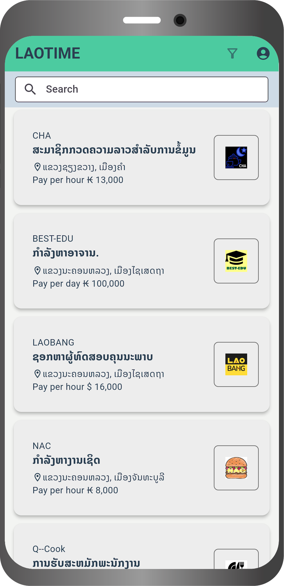 ເປັນສື່ກາງທີ່ເຊື່ອມໂຍງລະຫວ່າງຜູ້ຊອກງານ ແລະ ຜູ້ຈ້າງງານ ດ້ວຍການນໍາໃຊ້ທີ່ງ່າຍດາຍ. ຄົ້ນຫາງານທີ່ເໝາະກັບເຈົ້າໄດ້ຢ່າງສະດວກ ແລະ ທັນໃຈ ຜ່ານ LAOTIME.