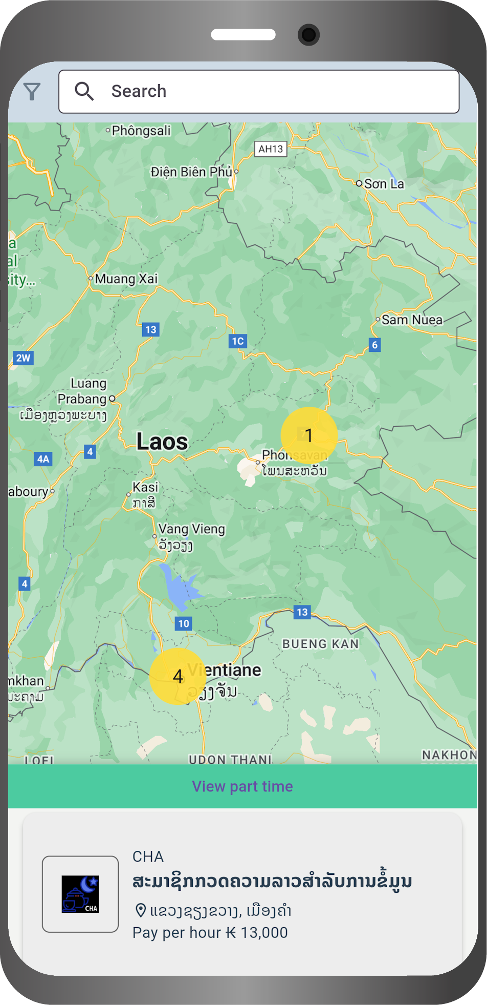 ສາມາດຊອກຫາຕາມພື້ນທີ່, ປະເພດວຽກ, ແລະ ປະເພດງານພາທໄທມ໌ ພ້ອມກັບຂໍ້ມູນສະຖານທີ່ໃກ້ຄຽງ.